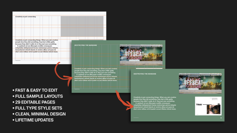 No more struggling with layout design or spending hours trying to make things look good. This template does the heavy lifting for you. Easily swap out text boxes and images with your work. Mix and match pages and type styles to create something that's truly your own.